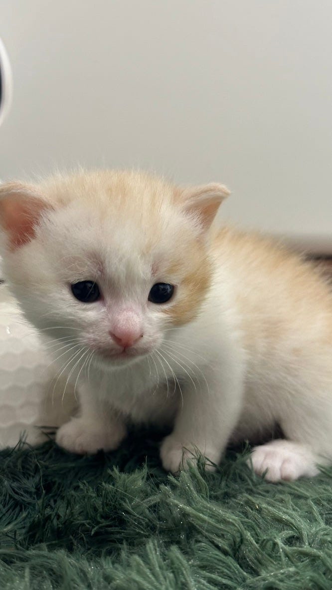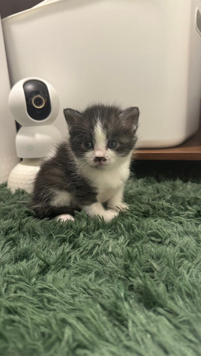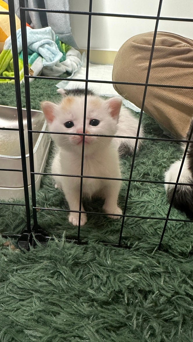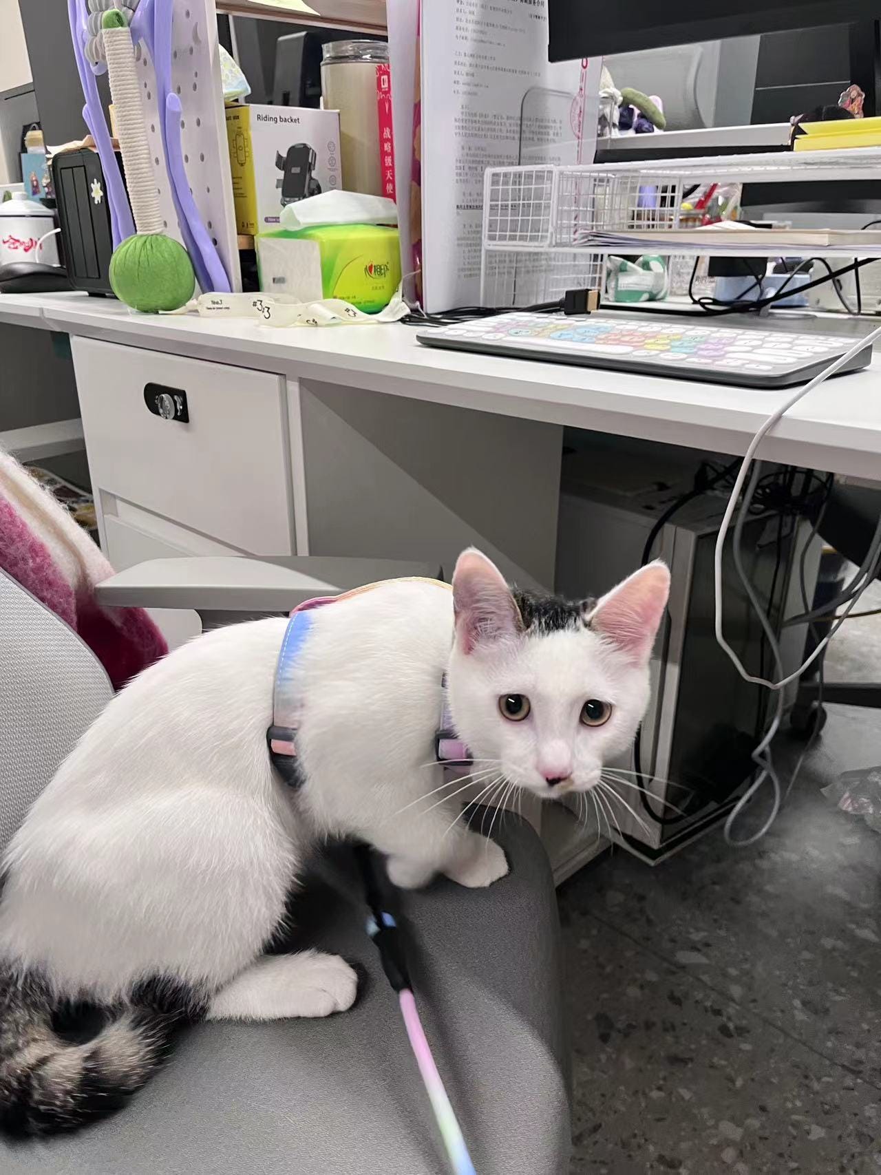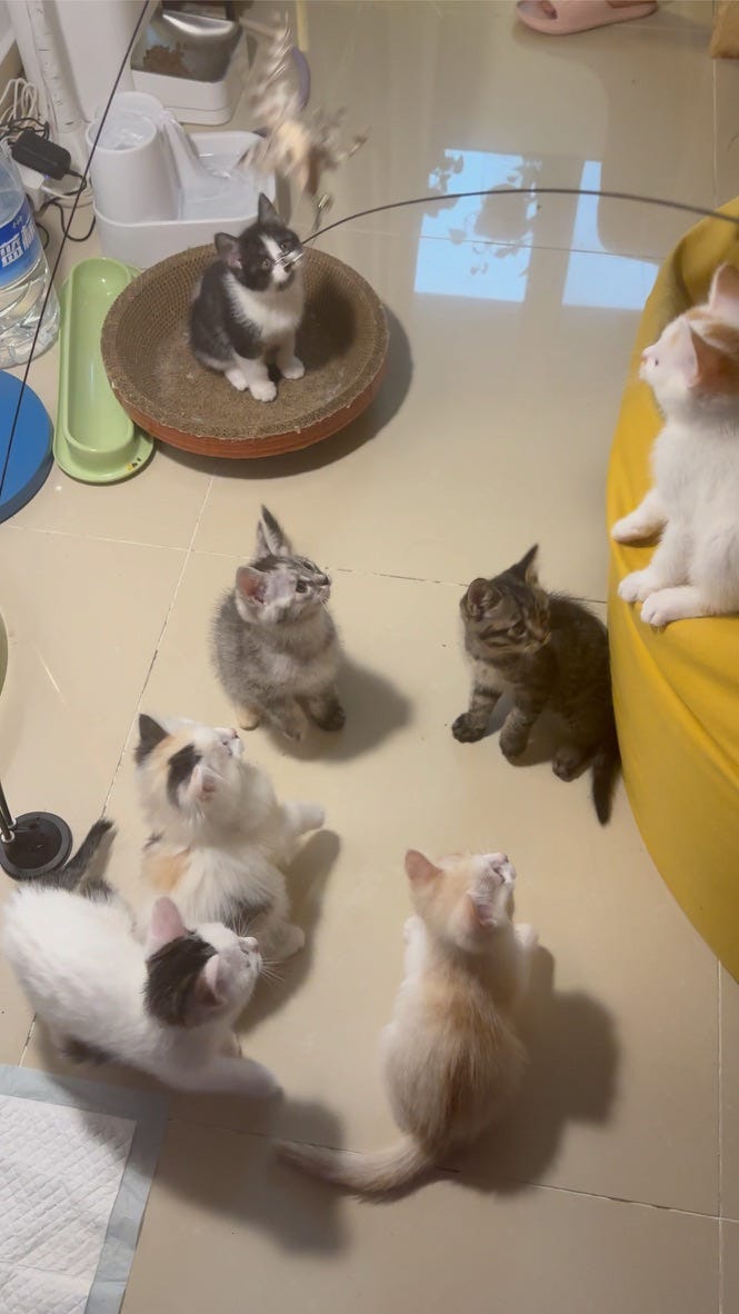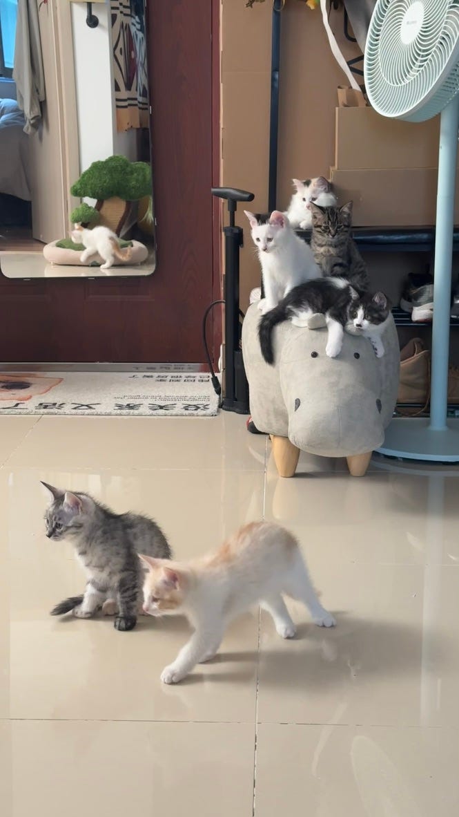 小猫幼儿园还有一位插班生宝宝,是我在公司楼下的树丛里捡到的,捡到它的时候,小猫大概只有一个半月大(因为从0开始养过七个小猫了所以我也算是个小猫专家),比家里的七个兄弟姐妹。声嘶力竭地狂叫,但是并没有太怕人,被我偷偷装在纸盒子里藏在了公司的装修楼层。它的运气很好,当天就在朋友的帮忙下找到了领养人,当晚就去往新家完成了逆天改命。领养人给它起名叫颩颩(diū),颩颩因为流浪的时间太短,没有碰到过坏人类,立刻就变成了粘人的乖小猫。