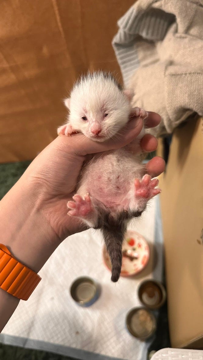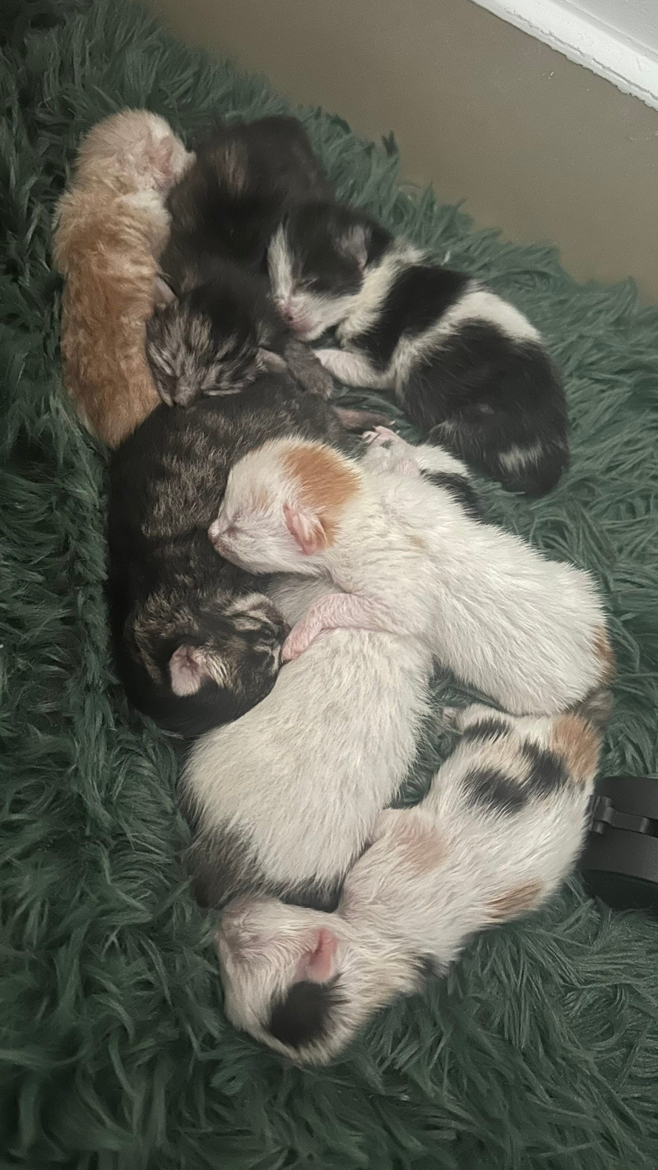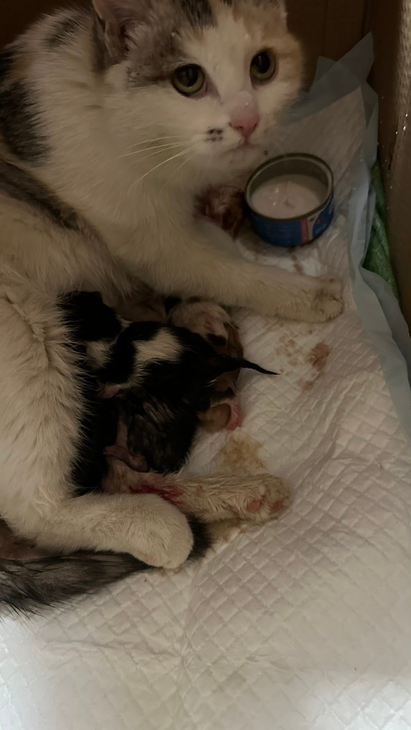 臭卷在我家待了不到一周就生了,那还是凌晨一点,我起来上厕所准备睡觉,听到沙发底下传来吱吱呀呀的细叫。发现已经生了两坨东西出来。于是紧急挪动家具拿出纸箱产房。臭卷生了四五个小时,期间吃了四个羊奶肉罐头。
