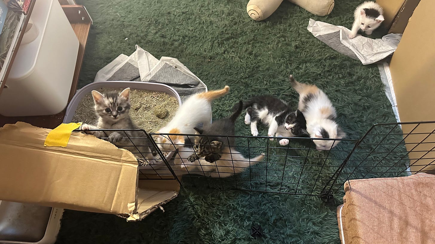 小猫满月后就开始调皮了,我在地毯上铺的尿垫每天都被扯得粉碎,并且掌握了攀爬要领的小猫们很快就学会了翻越围栏,并且会把头卡进围栏的洞里。我只好拿硬纸板把围栏包了起来,让它们没有下脚的地方,但小猫长得更快,一个半月的时候就能直接跳出围栏。我就把围栏撤了,顺带扔掉满是尿骚味的地毯,允许小猫在家里自由活动(指钻进各种奇怪的角落)