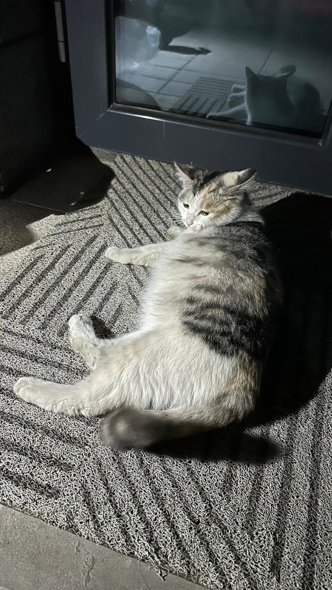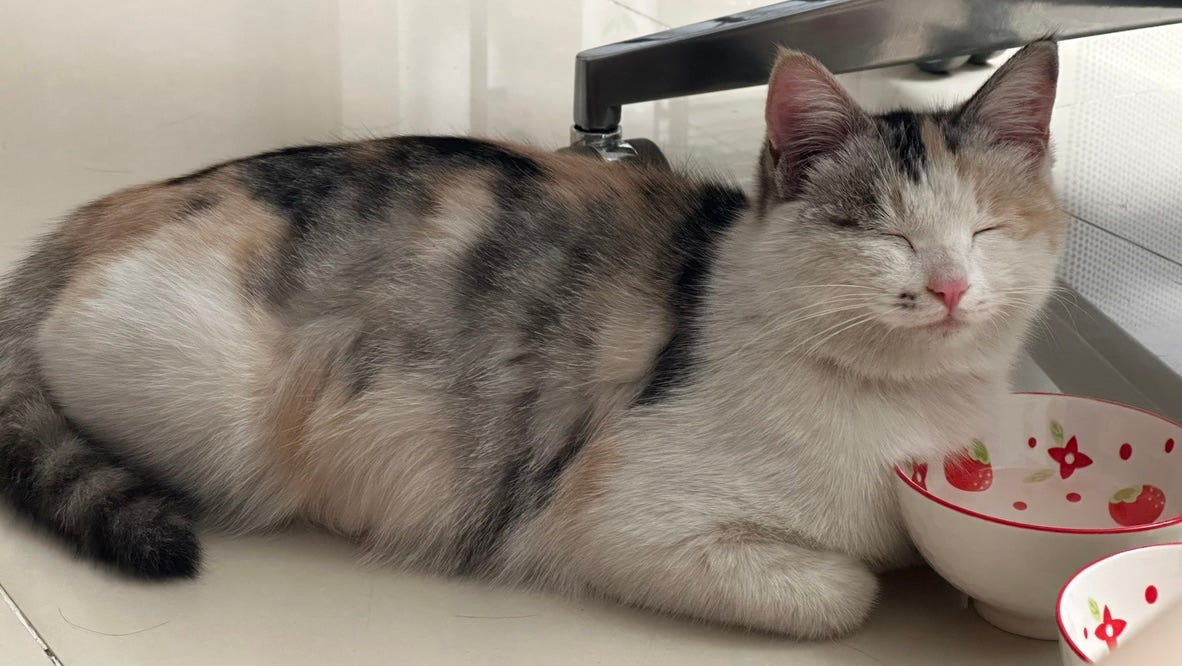 三月份的时候,在楼下碰到过几次一只亲人的流浪三花,躺在地上任人抚摸,后面几次看见它肚子越来越大,担心是腹水或怀孕,就诱拐回家。一到家也不叫也不躲,大口吃喝完就笑眯眯地睡着了。