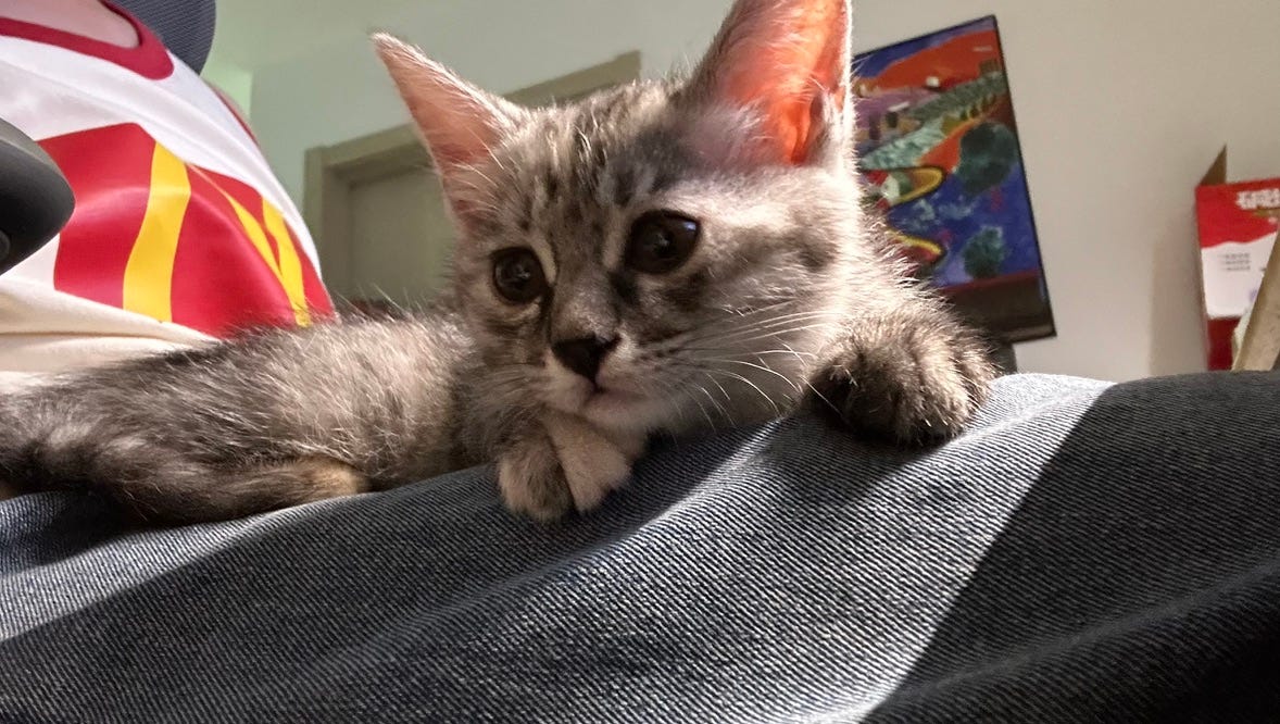 尽管猫妈已经给我造成了很大困扰,但小小猫是非常乖、非常粘人的一个家伙。在七个兄弟姐妹中,我留下它最大的两个原因,一是它特别能吃(体重至今和秃哥不相上下),二是它是第一个主动来人腿上睡觉的宝宝。